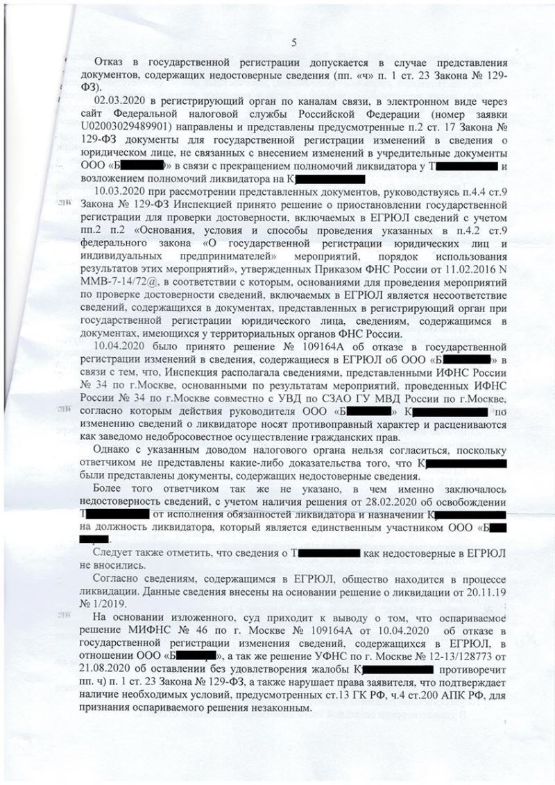 Разработана правовая позиция, согласно которой налоговый орган не имел основания для отказа в смене ликвидатора, подана обязательная досудебная жалоба в вышестоящий налоговый орган, а затем подготовлено и подано заявление в арбитражный суд о признании оспариваемого решения незаконным и обязании налогового органа сменить ликвидатора, также принято участие во всех судебных заседаниях.