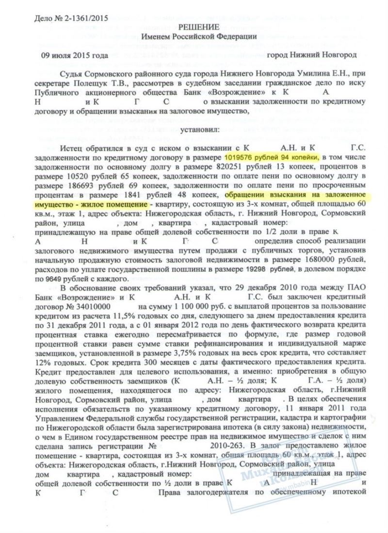 Несколько лет супруги К. выплачивали ипотеку, но начали допускать просрочки выплат - и банк потребовал досрочно вернуть весь оставшийся долг, а именно 1.020.000 руб. Естественно, такой суммой К. не обладали, и задолженность должна была быть возвращена путем ареста и продажи банком их жилплощади. При этом её стоимость была определена всего в 1.680.000 руб. То есть почти все деньги от квартиры должны были уйти на оплату долга.