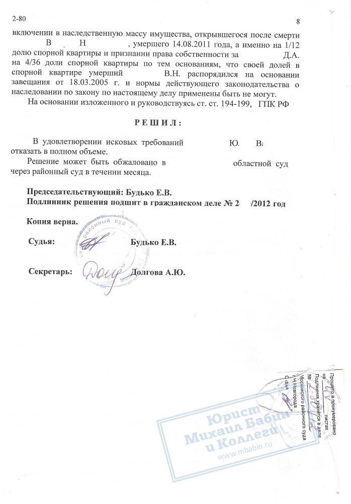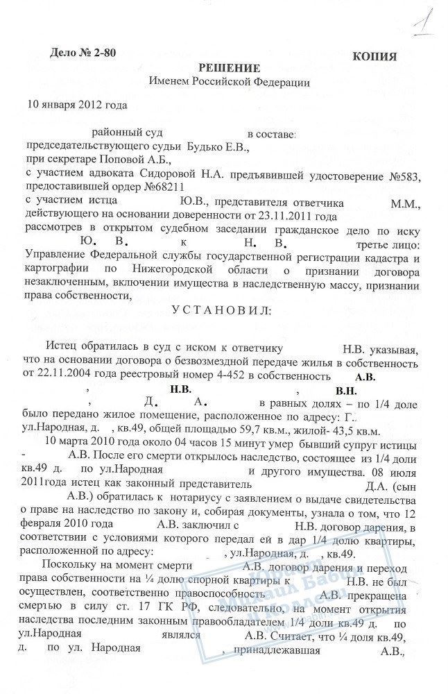 10.01.2012 гражданка Ю.В. обратилась в суд с иском к нашему клиенту Н.В. Требования состояли в том, что после смерти её бывшего супруга А.В. (он же сын нашего клиента Н.В.), ее несовершеннолетний сын Д.А. (уже усыновленный ее новым мужем) имеет право на долю в наследстве.