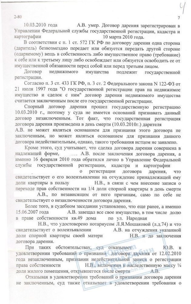 В ходе судебного заседания установлено, что дата регистрации договора дарения в реестре совпало с датой смерти, однако заключен он был при личном участии А.В. и Н.В., все нормы и правила регистрации были соблюдены. Из этого следует, что договор не может быть признан незаключенным. Рассмотрев все обстоятельства дела, суд вынес решение об отказе Ю.В. в удовлетворении исковых требований в полном объеме.