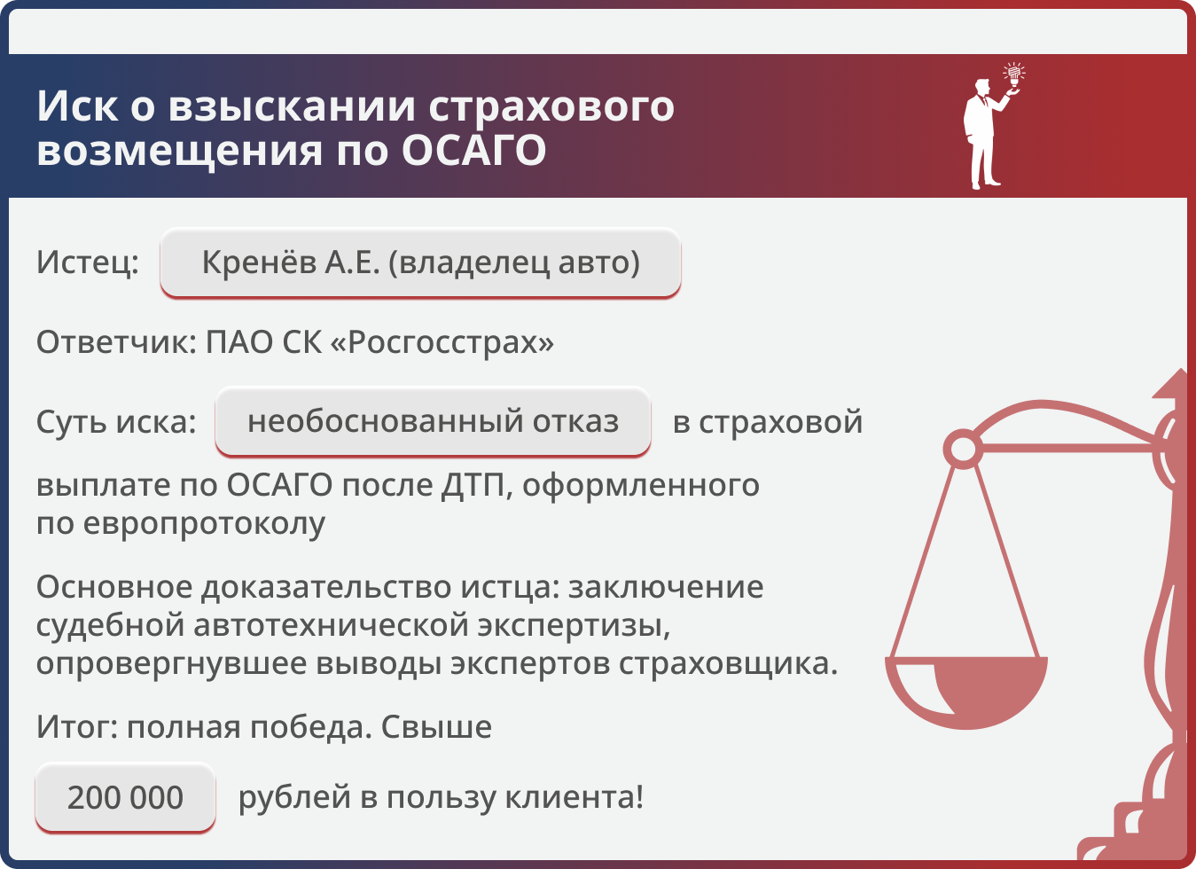 Страховая компания отказала клиенту в выплате, утверждая, что повреждения автомобиля не соответствовали обстоятельствам ДТП. Наша задача была доказать причинно-следственную связь и незаконность отказа. В результате суд не только признал случай страховым, но и взыскал в пользу клиента полагающееся возмещение, неустойку, штраф, компенсацию морального вреда и судебные издержки.
