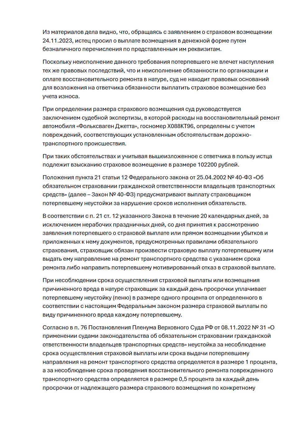 Мы инициировали и настояли на проведении судебной автотехнической экспертизы, которая, в отличие от заочных исследований страховой компании, основывалась на реальном осмотре автомобиля. Её вывод о наличии причинно-следственной связи стал центральным неопровержимым аргументом. Параллельно мы выстроили позицию на взыскание не только основного возмещения, но и всей сопутствующей ответственности страховщика за необоснованный отказ и просрочку.