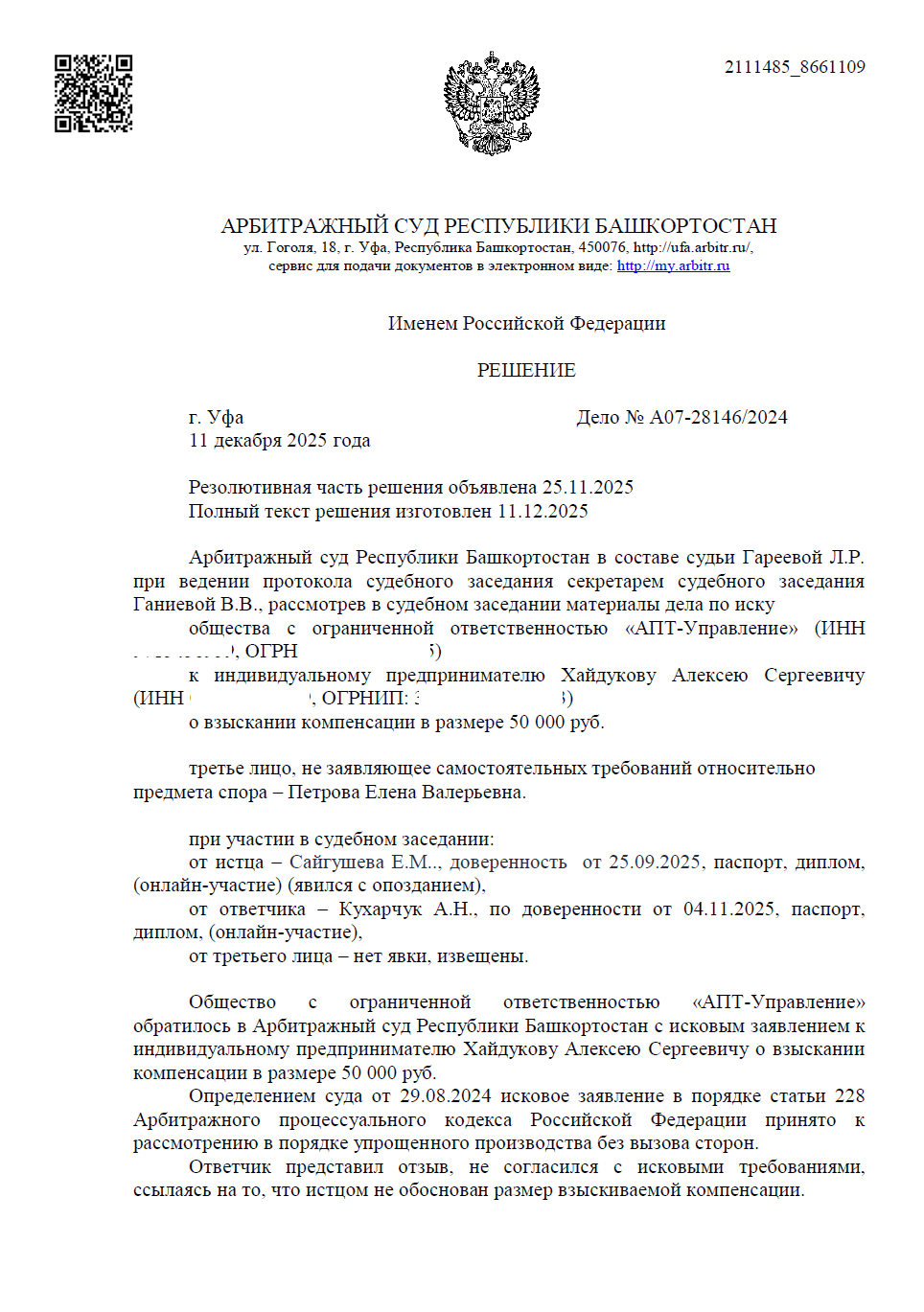 Истец (ООО «АПТ-Управление») обратился в суд с иском к ИП о взыскании 50 000 руб. компенсации за нарушение исключительных прав на фотографическое произведение «Фестиваль воздухоплавания "Небо России"». Основание — размещение фотографии на двух страницах сайта sim-portal.ru, принадлежащего ответчику.