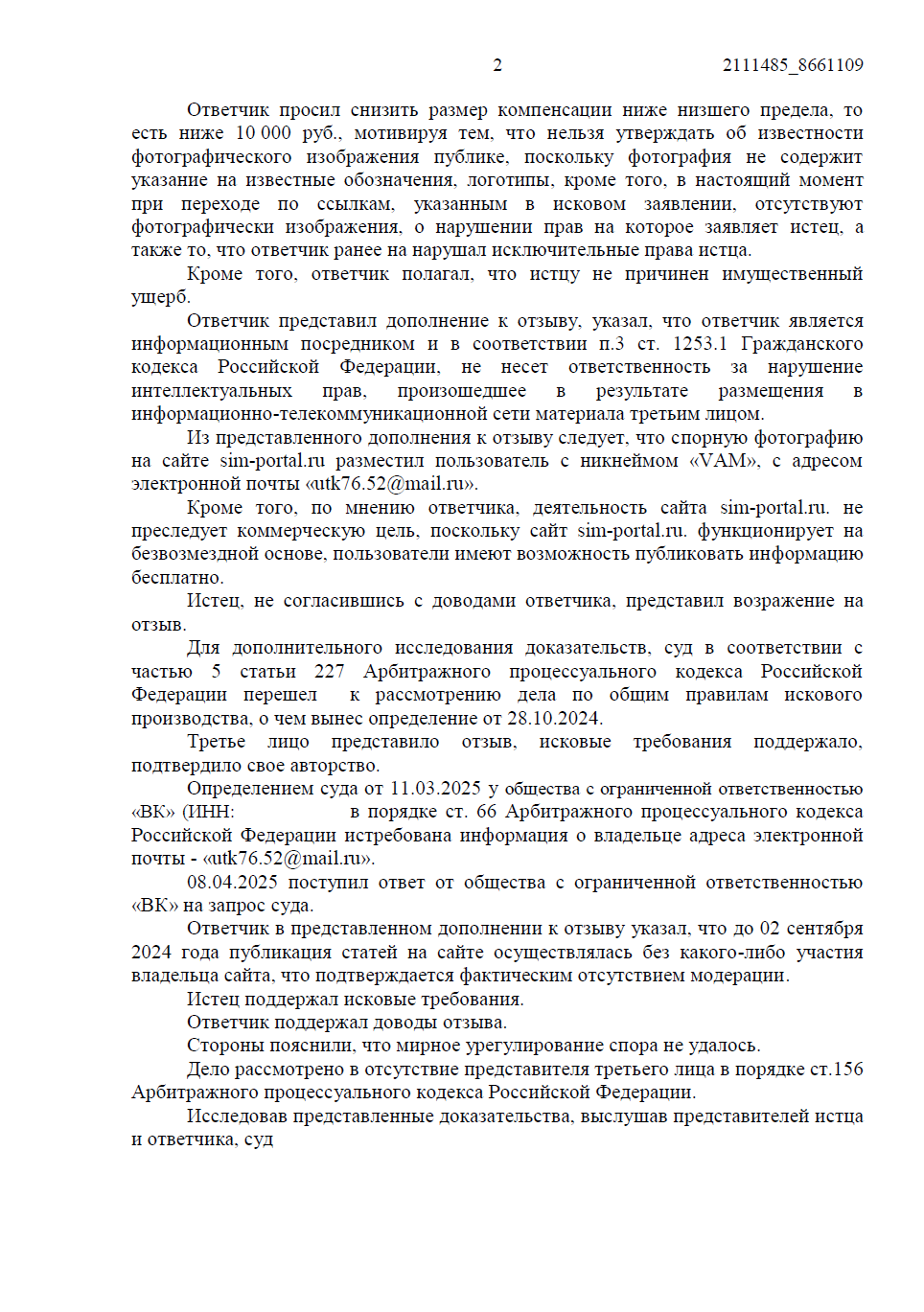 Фотография была опубликована без указания информации об авторе. Защита представила отзыв, заявила ходатайство о снижении компенсации и указала, что фотография размещена третьим лицом. Суд перешёл к рассмотрению дела по общим правилам искового производства для исследования дополнительных доказательств.