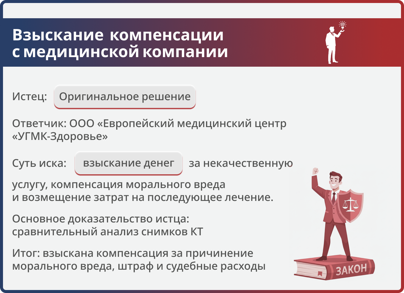 Главным козырем в деле стало заключение независимого специалиста. Оно подтвердило, что услуга была оказана с недостатками, а пациент из-за этого потерял драгоценное время для начала лечения.