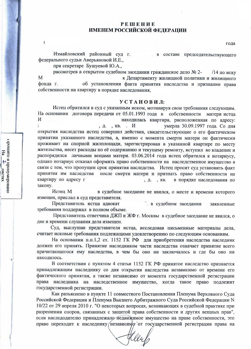 Решение об установлении факта принятия наследства