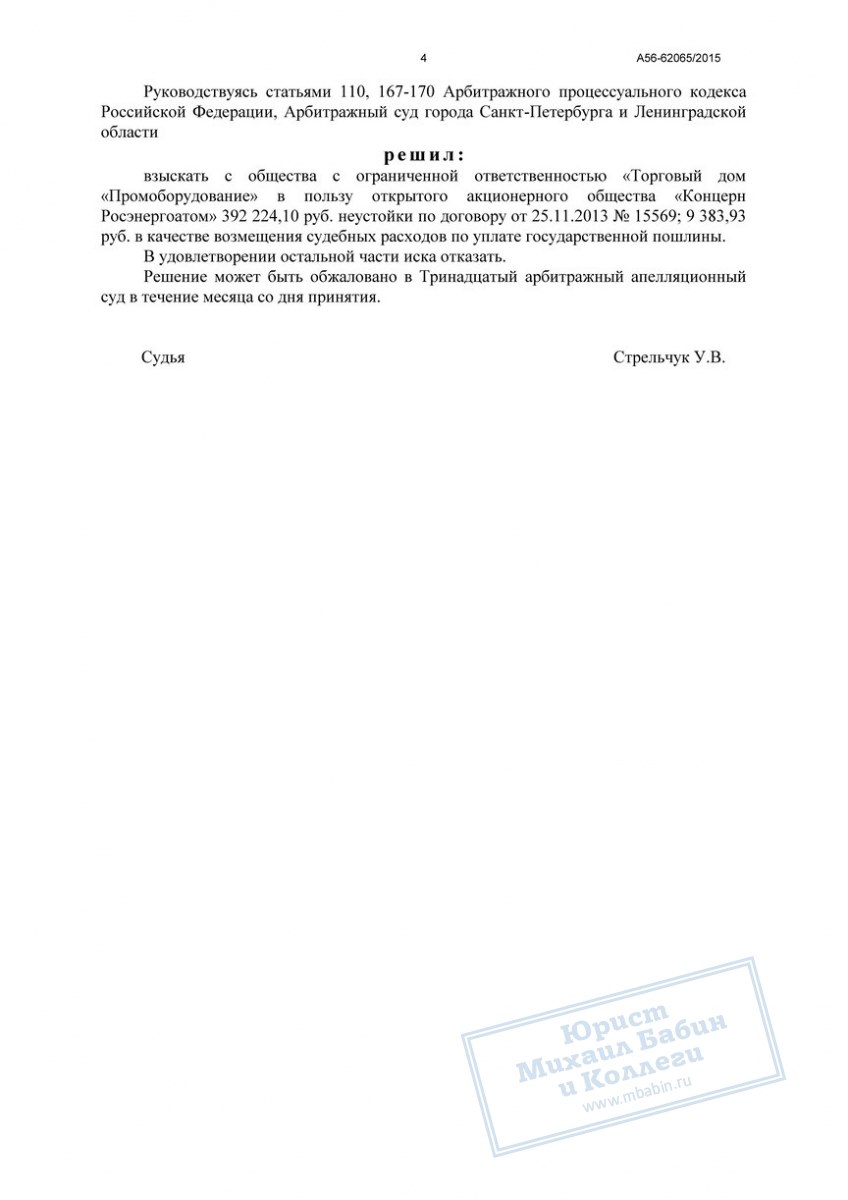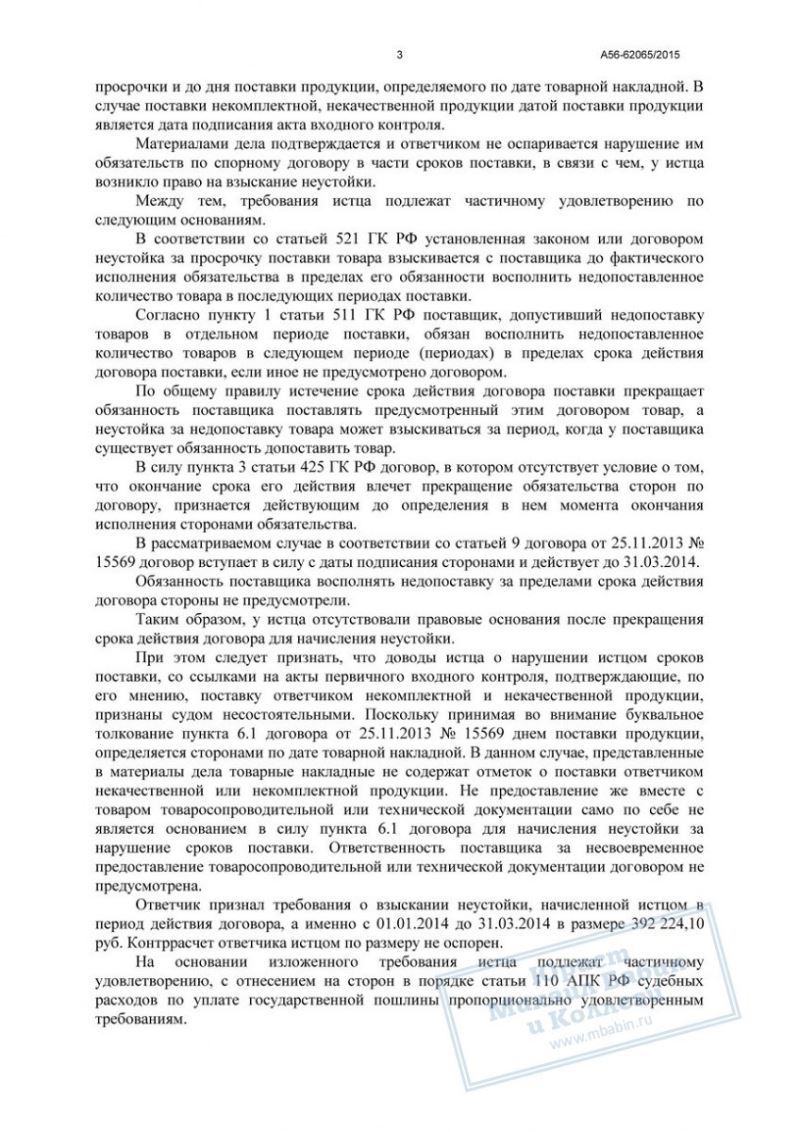 С делом работала наш юрист. Несмотря на очевидный факт недопоставки оборудования, юрист все-таки смогла помочь обратившемуся в нашу контору клиенту. Она доказала суду, что фактический период просрочки меньше заявленного истцом. В результате сумма неустойки была уменьшена до 392 т. р.